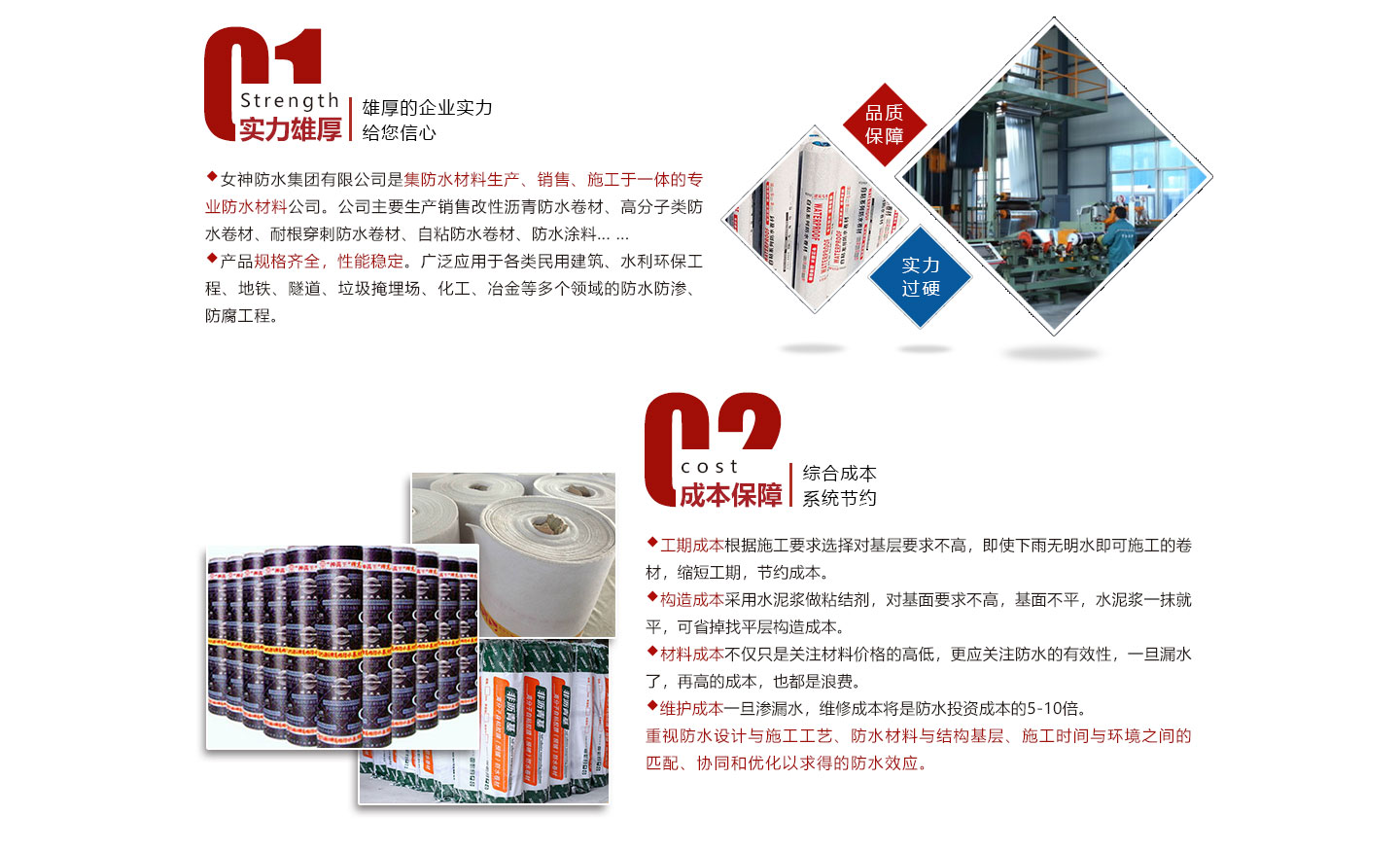 安徽女神建材科技集團(tuán)有限公司是集防水材料研發(fā)、生產(chǎn)、銷售、施工為一體的綜合性防水材料集團(tuán)公司。我公司旗下有多條大型一次成型生產(chǎn)線:SBS改性瀝青防水卷材,DTM聚酯復(fù)合高分子防水卷材,非瀝青基高分子防水卷材,PVC,TPO高分子防水卷材等生產(chǎn)線。我公司秉承“創(chuàng)新發(fā)展、實(shí)惠用戶”為宗旨,確保生產(chǎn)材料基礎(chǔ)上推出“共享生產(chǎn)廠家”,為開發(fā)商、建筑商節(jié)約成本為理念,新理念受到用戶企業(yè)集采時(shí)一致好評和認(rèn)可。在互聯(lián)網(wǎng)時(shí)代,我公司將以互聯(lián)網(wǎng)“共享”為發(fā)展理念,為開發(fā)商、建筑商、防水企業(yè)提供的產(chǎn)品,真正讓用戶企業(yè)達(dá)到巨大...